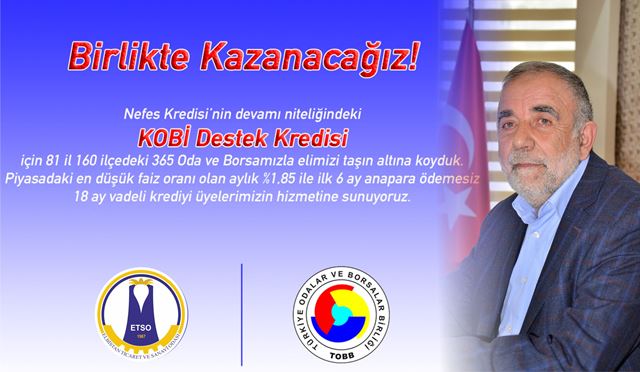 Küçük ve Orta Ölçekli İşletmelerin (KOBİ) finansman sorunlarının giderilmesine katkı sağlamak üzere KOBİ Destek Kredisi Projesi başlatılırken, Elbistan Ticaret ve Sanayi Odası da, Türkiye Odalar ve Borsalar Birliği ve bankaların protokolü ile hayata geçirilen KOBİ Destek Kredisi Projesine mali katkı sağlıyor.