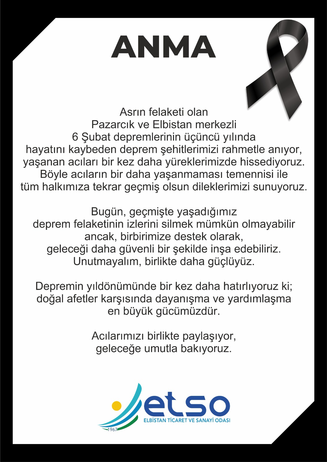 Asrın felaketi olan Pazarcık ve Elbistan merkezli 6 Şubat depremlerinin üçüncü yılında hayatını kaybeden deprem şehitlerimizi rahmetle anıyor, yaşanan acıları bir kez daha yüreklerimizde hissediyoruz. Böyle acıların bir daha yaşanmaması temennisi ile tüm halkımıza tekrar geçmiş olsun dileklerimizi sunuyoruz.